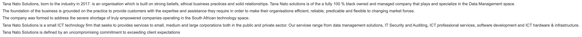 Data is the foundation of information that supports your decisions and actions. If your data is relevant, complete, accurate, timely and consistent, then it will be an asset. If not, it could be useless and even potentially harmful. We can deliver effective data management, which helps in minimising potential data problems and the damaging effects caused by them. Our team member have been implementing data management solutions for over 10 years. Our resources have worked and utilised DAMA Framework in order to successfully implement data management projects as recognised in the data industry as world class. Our resources are fully associated and registered members of DAMA SA. At Tana Nato Solutions, we believe that data management is a foundation for successful implementations of Fourth Industrial Revolution “Disruption Phenomenon”. v Artificial Intelligence (AI), Machine Learning (ML), Internet of Things (IoT) and etc.